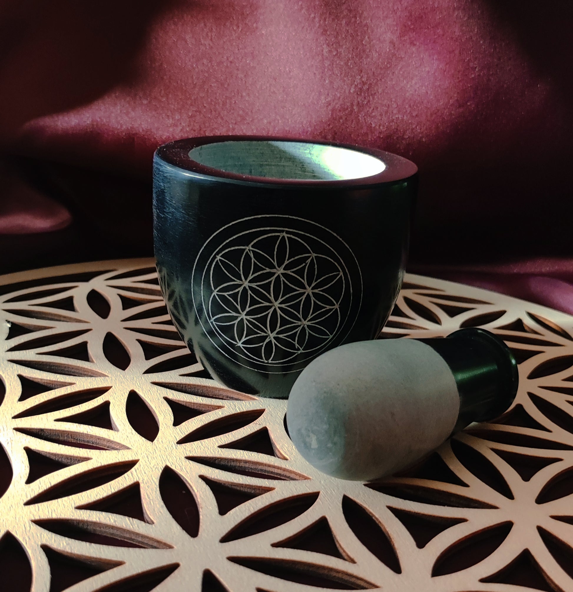 Mortier en saponite noire, orné d'une gravure de la fleur de vie. Idéal pour broyer vos herbes, épices, résines ou encens.